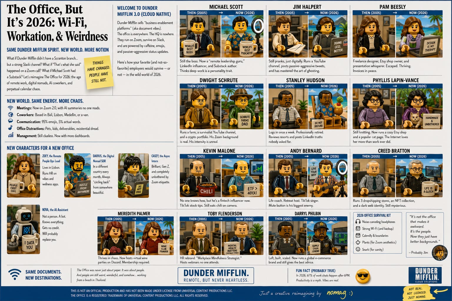 Dunder Mifflin is now “Dunder Mifflin Cloud Solutions (formerly paper, now vibes).” Nobody really knows what they sell anymore. Something about “document ecosystems.” The sales team is spread between Lisbon, Bali, and someone’s parents’ house in New Jersey.